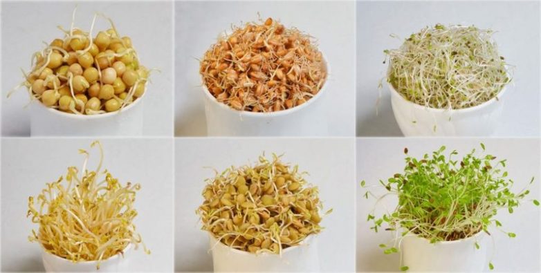 Пророщенные ростки: При проращивании улучшается качество белка и содержание волокон в бобах, орехах, семенах и зернах; в пророщенных семенах подсолнечника содержатся одни из самых высококачественных белков, которые вы можете съесть, а также обилие железа и хлорофилла; также хорошими источниками являются пророщенная полба, конопля, лебеда и фасоль;
