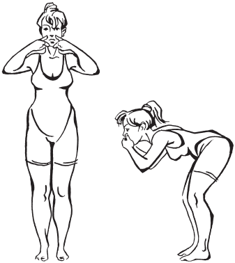 Исходное положение: основная стойка, сделать вдох и подушечками больших пальцев рук зажать ноздри. Таким образом создается остановка дыхания.Затем, наклонив туловище параллельно полу, сгибать ноги в тазобедренных и коленных суставах с задержанным дыханием возможно большее число раз.