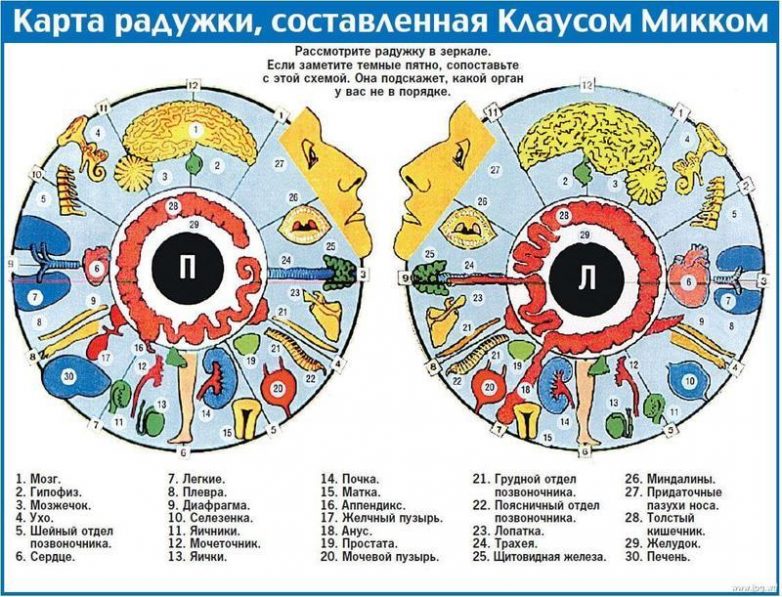 Глаз можно условно разделить на множество секторов, каждый из которых отвечает за определенный орган. При этом оболочка правого глаза соответствует правой стороне тела, а левая, соответственно — левой.