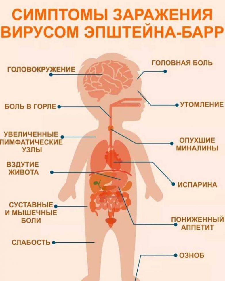 Вирус Эпштейна-Барр относится к герпесной группе. У большинства людей складывается представление, что поражение герпесными вирусами обязательно проявляется пузырьками на губах, язвочками на слизистой носа. Однако инфекционный мононуклеоз имеет другие признаки: повышение температуры тела, общая слабость, мышечная боль и др.В первые дни состояние больного очень напоминает картину острых вирусных заболеваний (ОРЗ).
