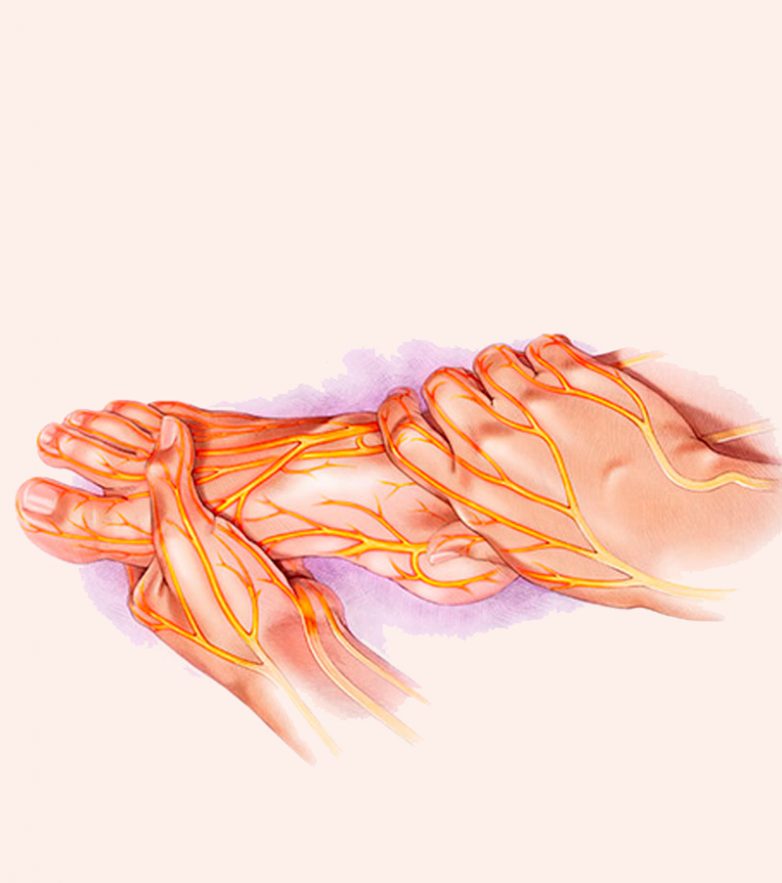 гипотрофия или атрофия пальцев рук и ног, онемение.