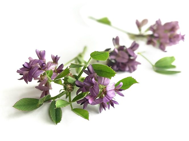 Многолетнее растение семейства бобовых, родиной которого считается Китай, обладает высокой питательной ценностью, в связи с чем часто применяется при расстройствах пищеварения. В состав растения входят изофлавоны и флавоны (вещества, регулирующие гормональную активность у женщин), сапонины (вещества, блокирующие поглощение холестерина) и хлорофил, который способствует очищению всего организма. Также люцерна содержит минералы (железо, цинк, калий, кальций) и кислоты (лимонная, яблочная, аскорбиновая, фумаровая, щавелевая).