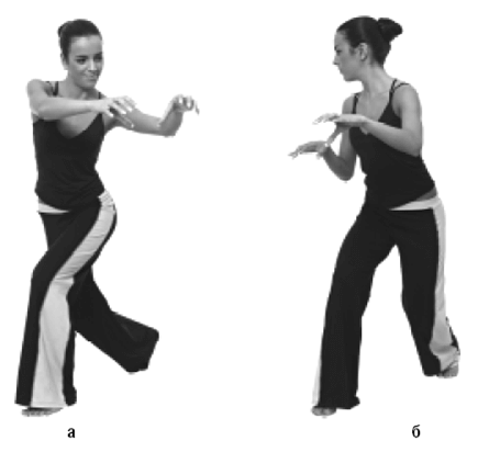 Вспомните кошку, которая подкрадывается к воробью. Повторяйте ее движения – чуть-чуть приседая, поворачивайтесь то вправо, то влево (рис. 5). Тяжесть тела переносите то на правую ногу, то на левую – в зависимости от того, в какую сторону вы повернулись. Вы уже пробовали так делать в начальных упражнениях.