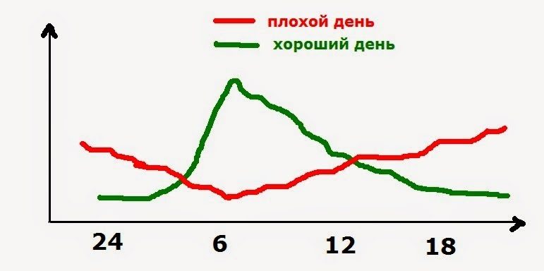 Утро: вы просыпаетесь по будильнику, отводите время, долгий мучительный подъем. Так уровень кортизола низкий, то встать нет никаких сил и энергии. Встали поздно, спешите, нет аппетита да и времени поесть. Голова не работает. Пытаетесь взбодриться кофе.День: хочется спать, вы пытаетесь понять, что происходит и что нужно от вас людям вокруг, долго «раскачиваетесь». К обеду это получается и вы приходите в норму. Уровень кортизола повышается, жизнь налаживается. Спешите, пытаясь переделать накопленные дела.
