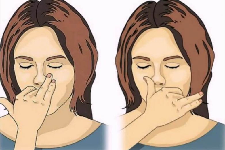 4. Вдохните через правую ноздрю, закройте ее большим пальцем и снова задержите дыхание. Затем отпустите безымянный палец и мизинец от левой ноздри и медленно выдохните через левую ноздрю.