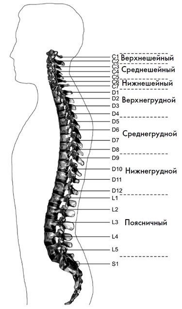 Прежде чем выполнять упражнения, посмотрите рисунок, на котором указаны отделы позвоночника.
