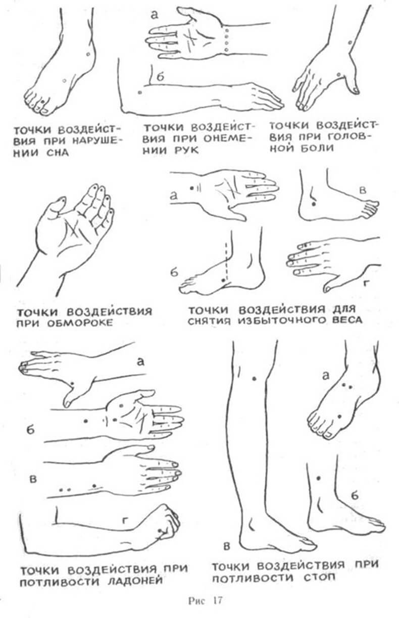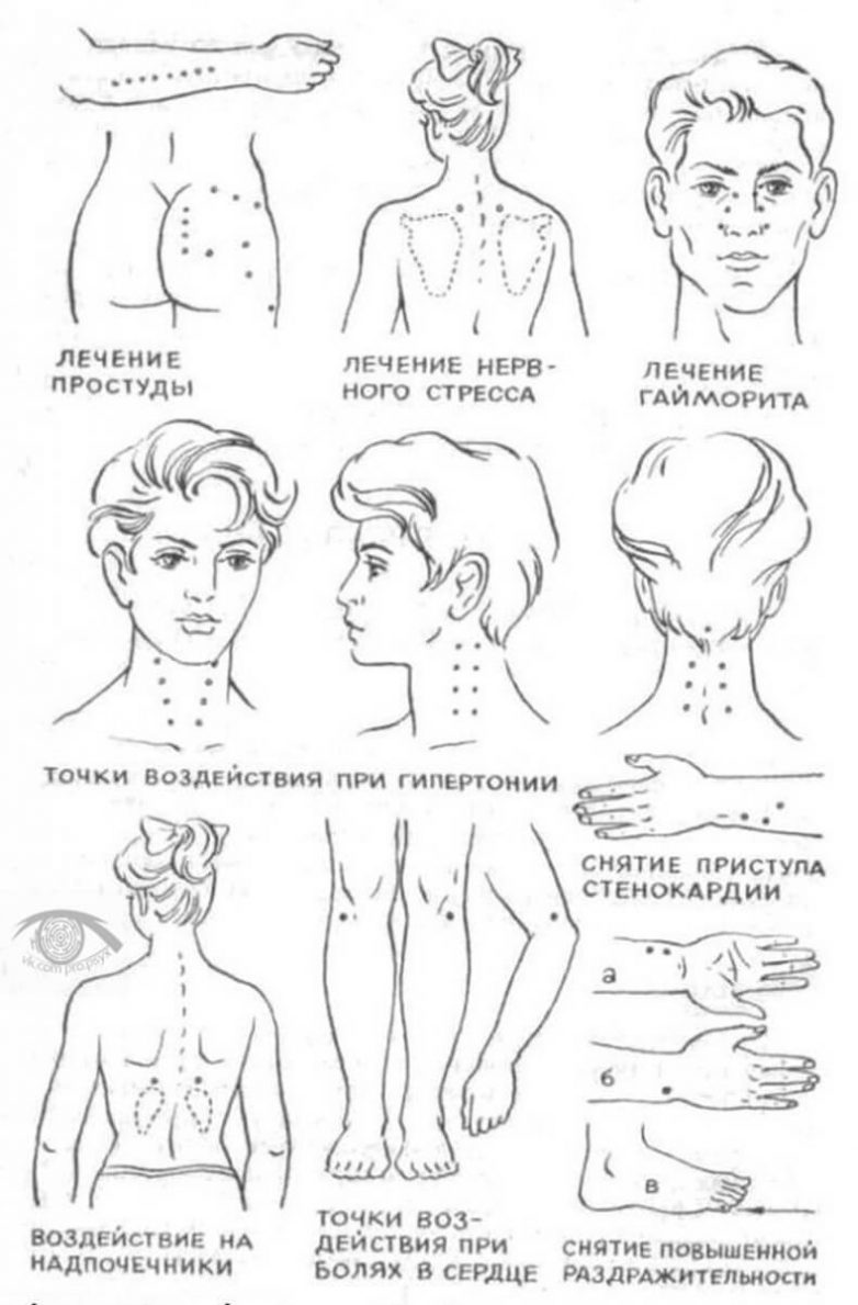 Воздействуя на те или иные точки на теле человека, можно снимать боль (зубную, головную, желудочную или т.д.), стимулировать работу внутренних органов и лечить болезни. Чтобы добиться желаемого эффекта нужно массировать нужную точку 2-5 мин.