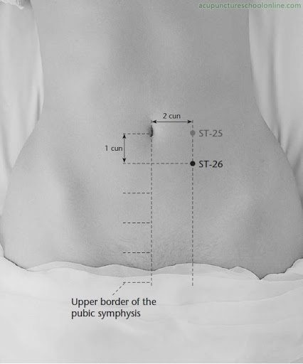 3. ST25 – две точки, расположенные на 1 см вправо и влево от пупка. Воздействие на эти зоны устраняет боль в животе, вздутие, диарею и нормализует менструальный цикл.