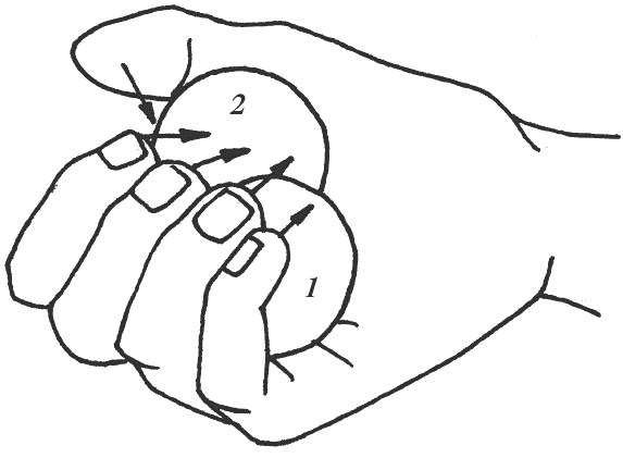 Возьмите три шара. Движением большого пальца направьте шар 1 по направлению к мизинцу. Движением мизинца направьте шар 2 по направлению к безымянному пальцу. Под давлением двух других шаров шар 3 автоматически сдвинется по направлению к большому пальцу.