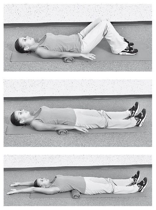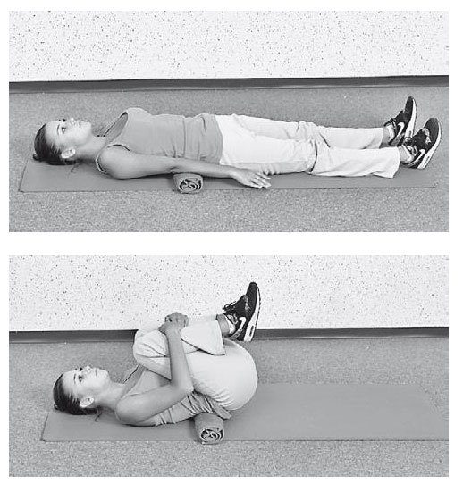 3. «Лежа на валике, оба колена к груди». ИП: лежа на валике или полумяче под поясницей, ноги выпрямлены. Степень сложности: ЛЕГКАЯ.