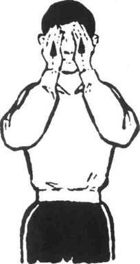 Ноги на ширине плеч. Одна рука заведена за спину, ладонью другой руки проводим от лба до затылка. Тело развернуто в сторону заведенной за спину руки. Затем тело поворачивается в другом направлении, руки меняются и повторяется массаж другой рукой. Делается 6 раз каждой рукой.