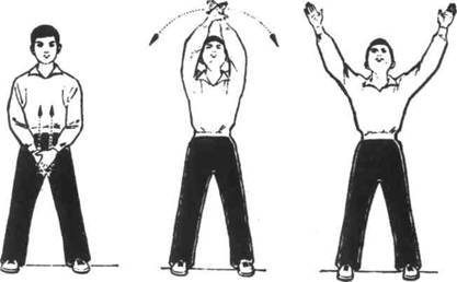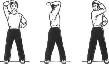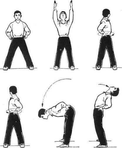 Исходное положение как в предыдущем упражнении. Руки поднимаются вверх вытянутыми ладонями, потом ставятся на пояс большими пальцами вперед, остальные пальцы разворачиваются к пояснице. Корпус тела поворачивается налево и направо и обратно — направо и налево, затем наклоняемся вперед, а затем назад. Упражнение повторяется 4-6 раз.