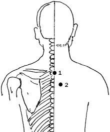 1. Область под остистым отростком 1-го грудного позвонка. Она традиционно используется для снятия лихорадочных состояний, озноба, головной боли, ощущения тяжести в голове, сонливости, для уменьшения напряжения и снятия боли в спине.