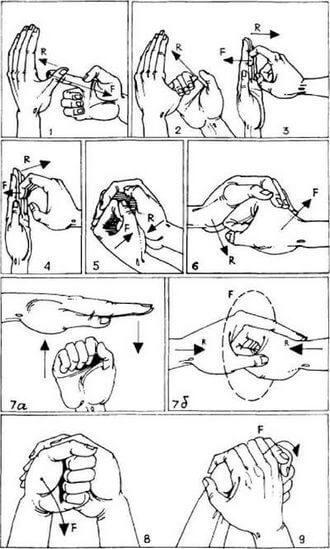 5. Ладонью правой руки обхватите сверху сжатую в кулак кисть левой и поверните ее в направлении стрелки F (см. рис. 4, 8).