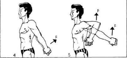 10. То же, что и в упражнении 9, но кисть левой руки подведите снизу под локоть правой руки (см. рис. 7, 4). Направление движения правой руки — вниз — показано стрелкой F.
