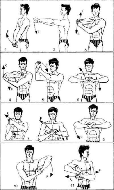 12. Согните руки в локтях и поднимите их почти до уровня плеч. Запястье правой руки обхватите левой рукой (см. рис. 7, 9). После этого опустите вниз локоть правой руки, преодолевая сопротивление, создаваемое с помощью левой руки.