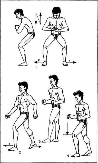 8. Вес тела перенесите на левую ногу, правую поставьте в сторону на носок. Быстро присядьте на левой ноге с резкой остановкой (см. рис. 11, 4).