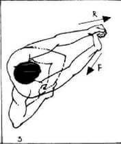 11. Согните правую руку в локте и поднимите ее вперед-вверх так, чтобы плечо занимало горизонтальное положение, а угол между плечом и предплечьем составлял 90 градусов (см. рис. 7, 5). Левой (опорной) рукой обхватите запястье правой, затем предплечье правой руки опустите движением к себе (по стрелке F), насколько позволяет подвижность суставов.