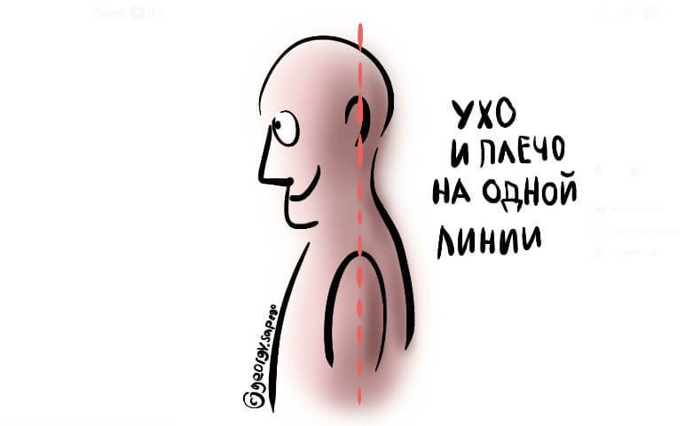 Это еще называют «ходить высоким» — грудь вперед, а плечи назад. Нельзя наклонять голову. Если посмотреть сбоку, то уши должны быть на одной вертикальной линии с плечами. Такое упражнение помогает бороться с вредным «передним положением головы» (Рисунок 1).