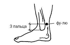 3. Фу-лю, точка канала почек расположена на ноге, на 3 пальца выше внутренней лодыжки, у переднего края пяточного сухожилия. Используется при чрезмерном брожении в желудке и кишечнике.