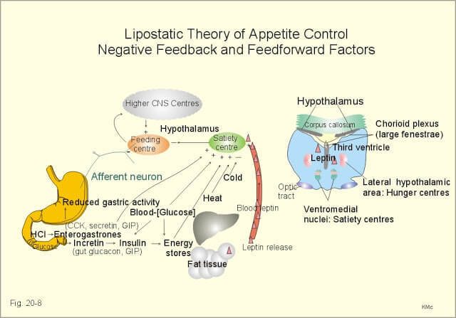 Гипоталамус регулирует ключевые процессы обмена веществ в организме. Если мы с вами говорим про голод и температуру, то связь их проста. Гипоталамус может регулировать энергию и удерживать нормальный вес либо контролируя процесс поступления пищи (аппетит) либо регулируя теплоотдачу и сжигание (уровень физактивности, работа бурого жира, щитовидки и т.п.).Возможными механизмами регулирующими работу центра аппетита, являются уровни глюкозы, инсулина, свободных жирных кислот и целый ряд гормонов. Вместе они образуют сложные регуляторные сети. После приема пищи в крови повышается концентрация некоторых гормонов, например лептина и инсулина. Голодание, соответственно, ведет к снижению их концентрации.