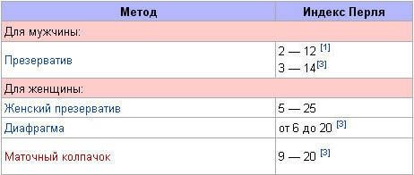 (Для справки: в конце статьи находится сравнительная таблица, индекс Перля при использовании разных методов контрацепции (туда же входят и «Естественные методы»)).