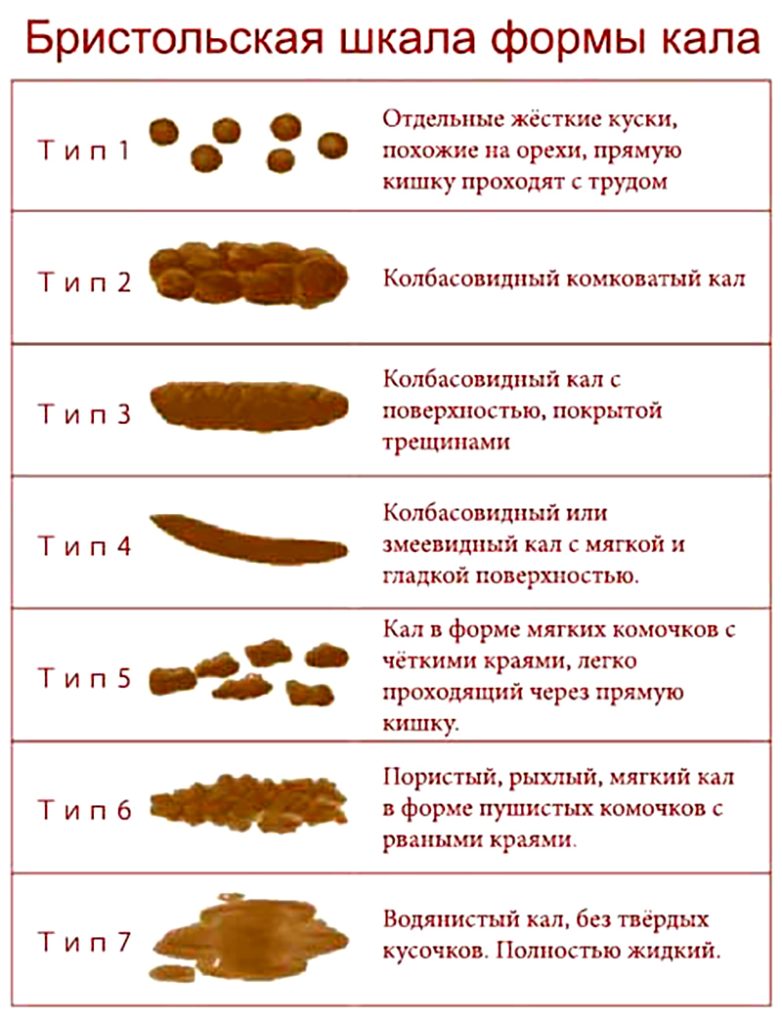 Бристольская шкала формы кала – это удобный инструмент, который помогает понять состояние дел. В идеале, ваш стул должен приближаться к типам 3, 4 и 5 – от «колбасовидного или змеевидного с мягкой и гладкой поверхностью» до «мягких комочков, легко проходящих через прямую кишку». Тип 4 — золотая середина.