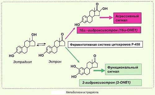 На первом этапе эстрогены под действием ферментов группы цитохрома Р450 подвергаются трансформации с образованием промежуточных продуктов: 2-гидрокси-, 16-гидрокси-, 4-гидроксиэстрогенов.