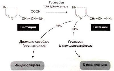 Секретированный после синтеза гистамин быстро метаболизируется (период полужизни — 1 мин) преимущественно по двум путям: окисление (30%) и метилирование (70%).