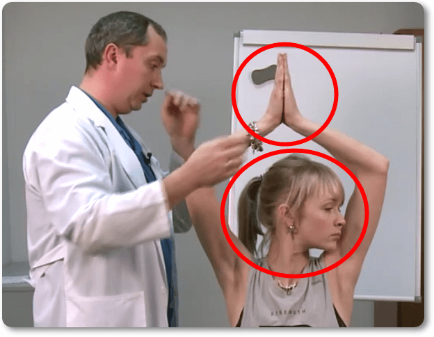 2. Сводим ладони над головой. Локти в стороны. Ладонями сильно надавливаем друг на друга.
