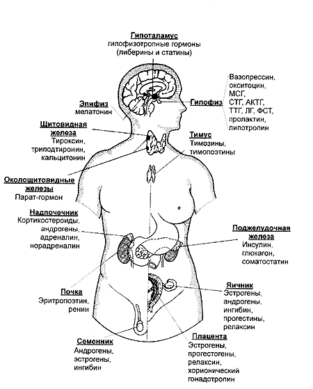 — падает уровень гормона, стимулирующего образование и секрецию гормонов щитовидной железы, лютеинизирующего гормона и фолликулостимулирующего гормона (ТТГ, ЛГ и ФСГ соответственно) -->