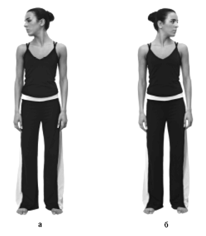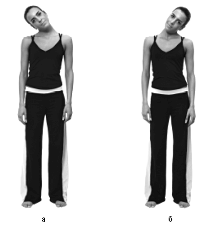 «Ушки»Займите исходную позицию, ноги расставьте немного уже ширины плеч. Начинаем покачивания головой. Сначала слегка наклоните голову вправо (рис. 2а), правое ухо направлено к правому плечу – одновременно шумный короткий вдох носом. Затем наклоните голову влево (рис. 2б), левое ухо направлено к левому плечу – одновременно сделайте вдох.