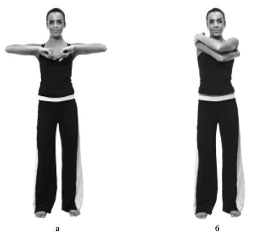 «Обними плечи»Встаньте прямо. Поднимите руки на уровень плеч, согните в локтях. Поверните ладони к себе и поставьте их перед грудью, чуть ниже шеи (рис. 6а). Теперь «бросайте» руки навстречу друг другу так, чтобы левая обнимала правое плечо, а правая – левую подмышку (рис. 6б).