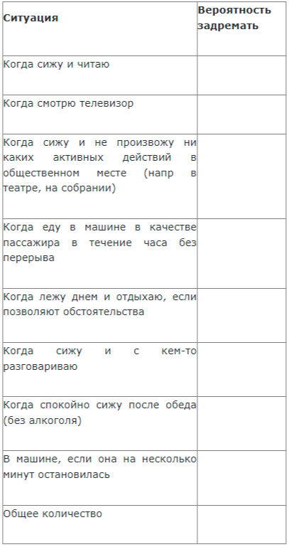 Насколько вероятно то, что вы можете задремать или уснуть в ситуациях, описанных ниже, по сравнению с ощущением обычной усталости? Речь идет об обычном вашем состоянии в последнее время. Даже если вы не были в подобных ситуациях в последнее время, то постарайтесь представить себе, как бы эти ситуации повлияли на вас.Используйте следующую шкалу для выбора наиболее подходящей цифры для каждой ситуации.