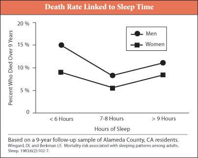 Смерть: в ходе несколько исследований было установлено, что у людей, которые спят по 9 или более часов за ночь, гораздо более высокие показатели смертности. Конкретные причины этой корреляции не выделяются.