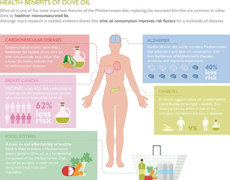 Потребление олеиновой кислоты, содержавшейся в оливковом масле, помогает предотвратить окисление ЛПНП-холестерина и, таким образом, уменьшает риски атеросклероза.