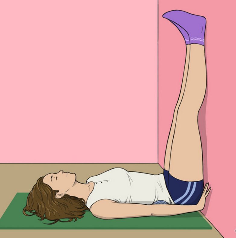 Упражнение очень простое – достаточно лечь на спину, поднять ноги и держать их в вертикальном положении, опираясь на стену 15 минут. Ягодицы и пятки следует плотнее прижать к стене, а для большего удобства под поясницу можно положить небольшую подушку. Такая зарядка гармонизирует основные функции организма.