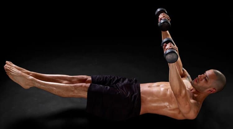 Выполнение: Поднимите ноги над полом, удерживая их на весу. Сводите гантели перед грудью, чтобы они касались друг друга (все это время ноги не должны касаться земли).