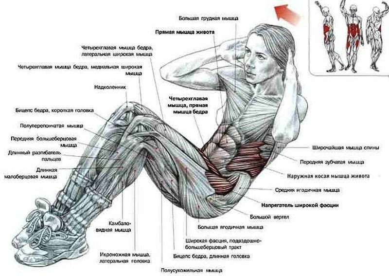 Исходное положение: Лягте на спину, ноги согните в коленях, стопы стоят на полу, руки за головой.Выполнение: Поднимайте спину (делая скручивание) до тех пор, пока не почувствуете, что ноги и лопатки уже не поддерживают ваше тело. В точке максимального напряжения задержитесь на несколько секунд, затем вернитесь в исходное положение.
