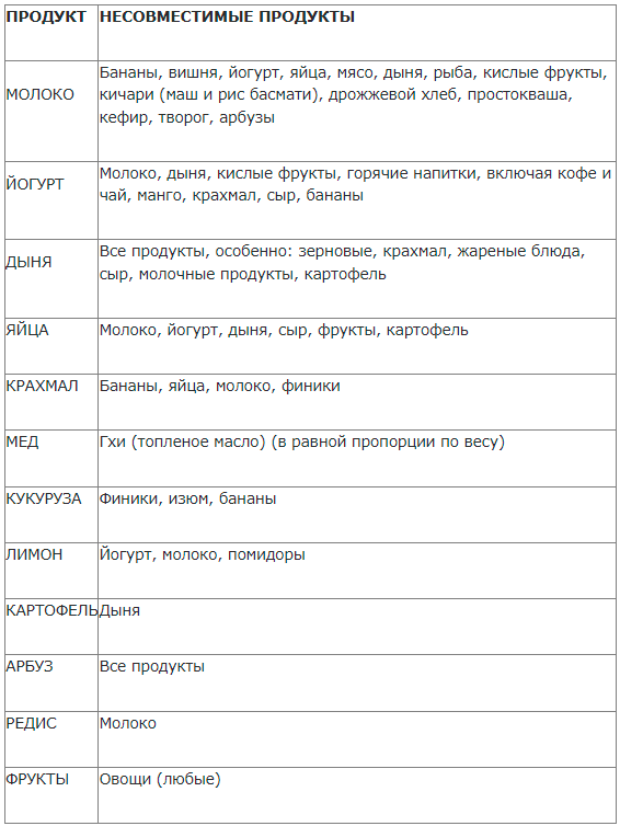 Согласно Аюрведе, определенные пищевые сочетания нарушают нормальное пищеварение и расстраивают равновесие дош. Неправильное сочетание продуктов может приводить к несварению, брожению, гниению и образованию газов.