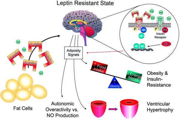 Этот гормон является одним из основных 4-х гормонов, которые определяют вес тела. Лептин синтезируется в жировой ткани и рецепторы к этому гормону есть в гипоталамусе, коре головного мозга и гиппокампе. Лептин действует как сигнал для мозга, чтобы остановить потребление пищи и регулировать объем хранения излишек калорий в жировых клетках. Одновременно этот гормон защищает не жировые ткани организма от токсической перегрузки жирами.