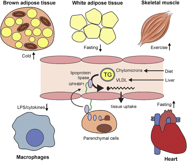 Активность липопротеинлипазы прямо пропрорциональна способности тканей захватывать жиры из крови и расщеплять их. Расщепление жиров происходит в основном внутри капиляров жировой ткани, скелетных мышц и сердечной мышцы. Жиры из крови поступают в клетки и используются по-разному: в адипоцитах — для синтеза жиров и их депонирования, а в миокарде и скелетных мышцах они окисляются, образуя АТФ, необходимый для работы этих тканей.Жиры в плазме присутствуют в составе липопротеидных частиц. Наибольшие из этих частиц, содержащие наибольшее количество жиров, слишком велики чтобы проникать из капилляров в межклеточную жидкость, т.о. жировые клетки не могут захватить их напрямую. Имеется интересный механизм преодоления этой трудности. Адипоциты продуцируют фермент липопротеинлипазу, которая гидролизует жиры в липопротеидных частицах до свободных жирных кислот, которые могут проникать в межклеточную жидкость и достигать адипоцитов. Поскольку липопротеинлипаза необходима в капиллярах, она экспортируется из адипоцитов в эндотелиальную выстилку капилляров жировой ткани. Затем липопротеинлипаза, содержащаяся в эндотелиоцитах жировой ткани, может взаимодействовать липопротеидными частицами.