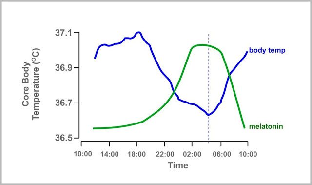 В 18-19 часов наблюдается максимальная температура тела, после чего она начинает снижаться. Хорошо, если отход ко сну совпадает с пониженной температурой тела. Индивидуальный биоритм времени скорейшего спада температуры (экстремальная точка перегиба на кривой) соответствует оптимальному времени для засыпания. Так — можно будет легко уснуть и быстрее выспаться. Поэтому улучшают засыпание все процедуры, связанные с охлаждением тела. Также важен и свет, желтый низкий свет способствует выработке мелатонина, который вызывает сонливость и контролирует температуру тела.