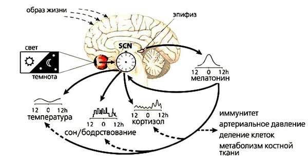 Биоритмы подразделяют на циркадианные (суточные), цирканнуальные (годичные), ультрадианные (длящиеся более суток), инфрадианные (длящиеся менее суток) и др. Центром регуляции биоритмов считается гипоталамус. Генератор циркадианных ритмов локализован в супра-хиазматических ядрах (СХЯ) переднего гипоталамуса. Супрахиазматические ядра получают информацию об освещенности через ретиногипоталамический тракт. Циркадианный водитель ритма реагирует на различные параметры освещенности — длину волн, продолжительность и время воздействия. Главным внешним синхронизатором циркадианной ритмичности является цикл свет—темнота, но даже при отсутствии внешних световых (солнечных) воздействий (бункер, подводная лодка, пещера и т.п.) циркадианные ритмы сохраняются, меняясь по длительности, за счет внутренней периодичности. Более того, мелатонин благодаря гипотермическим свойствам оказывает прямое влияние на циркадианный ритм температуры тела.
