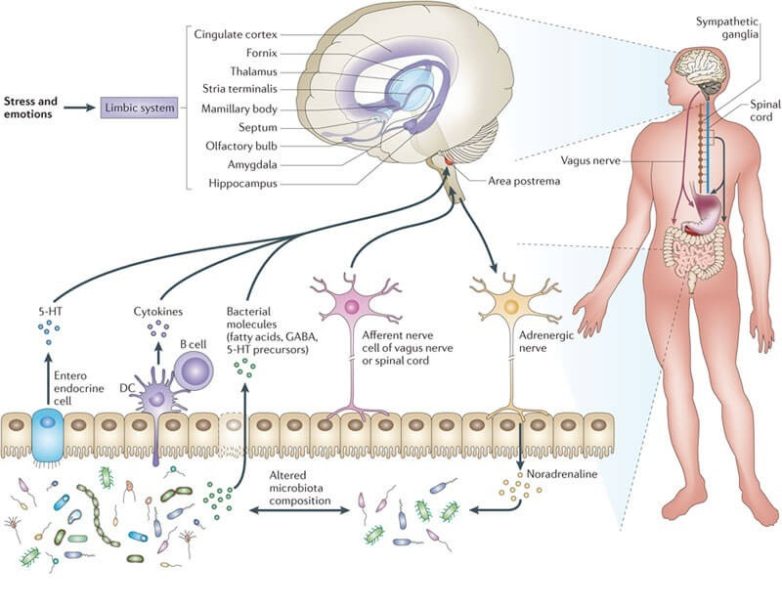 Стресс, эмоции, нисходящие и восходящие связи головного мозга и кишечника. (Nature Microbiology®)