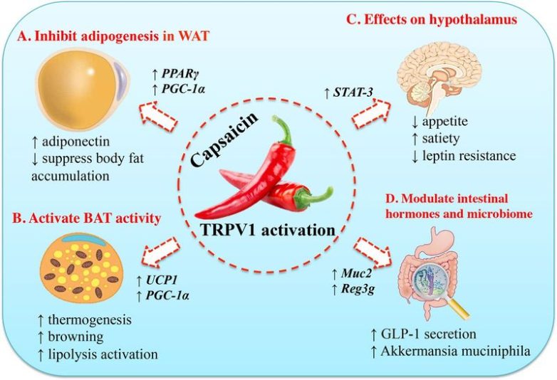 Капсаицин (красный перец). Действует через TRPV1-рецепторы. 0,01 процента капсаицина в диете позволяют предотвратить набор веса в ходе экспериментов на мышах дикого типа. Исследования на клетках, показали, что капсаицин в различных дозировках может стимулировать активность UCP, чем и вызвать повышенное сжигание калорий.