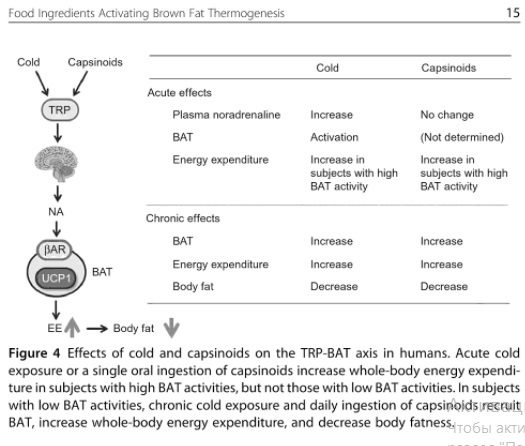 Кроме холода, темноты и физической активности, большое значение для увеличения уровня разобщающих белков UCP играет и питание. Но обратите внимание, что питание будет работать только при наличии хоть мало-мальски функционирующей бурой жировой ткани, т.е. оно способно усилить, но не заменить эффект закаливания и физической активности.