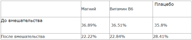 В целом, магний и В6 имели схожие показатели эффективности для предменструального синдрома в этом исследовании. Средние показатели до и после вмешательства в трех группах распределились следующим образом: