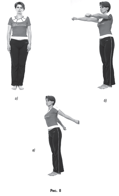 Ноги вместе, руки вниз (рис. 8, а). Делаем одновременные широкие круговые движения руками (рис. 8, б, в), сначала по часовой стрелке, затем против часовой стрелки. Дыхание произвольное. Выполняем по 3–5 раз в каждую сторону.