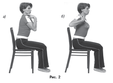 Руки, максимально согнутые в локтевых суставах, держим на ширине плеч, ноги вместе. Начинаем круговые движения локтями: 5–6 раз по часовой стрелке и столько же – против часовой стрелки (рис. 2, а, б).